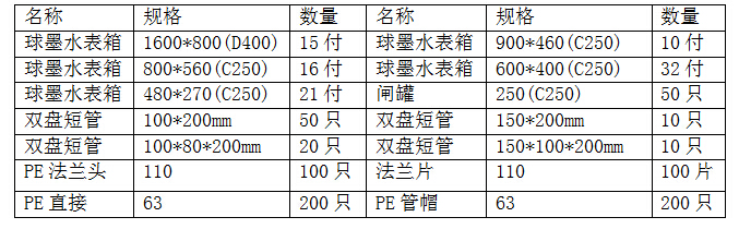 1、采購(gòu)內(nèi)容:球墨水表箱、雙盤短管、閘罐、PE法蘭頭、PE直接等