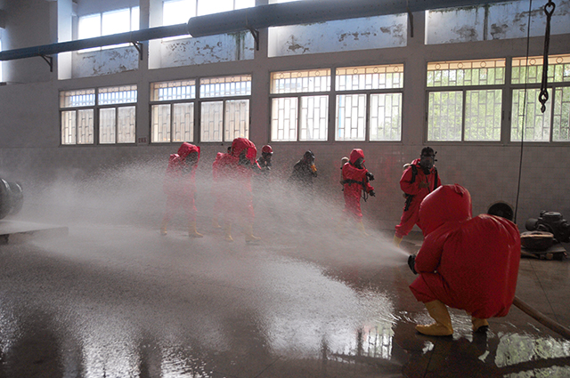 此次演練,花湖水廠一車間氯氣瓶閥門發(fā)生泄漏,并有員工吸氯后暈倒現(xiàn)場,該廠立即啟動一級預(yù)案進(jìn)行現(xiàn)場搶救,同時(shí)撥打“119”報(bào)警。搶救小組按職責(zé)分工迅速展開救援和災(zāi)害處置,黃石消防中隊(duì)?wèi)?yīng)急救援隊(duì)出動2輛搶險(xiǎn)救援車。各搶救人員有條不紊地展開處置,按照防護(hù)、偵檢、警戒、救生、排毒、關(guān)閥斷料、堵漏等程序圓滿完成了此次液氯泄漏事故處置任務(wù)。