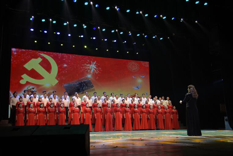 在演出現(xiàn)場,公司的歌舞節(jié)目《點亮未來》作為開場舞閃亮登場,激情的歌舞、絢麗的變臉、華美的舞服將整個舞臺映襯得火紅喜慶。合唱《前進(jìn)吧,中國共產(chǎn)黨》在演員們整齊劃一的歌聲、鏗鏘有力的動作中獲得陣陣喝彩,演出獲得圓滿成功。