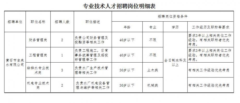 報名者應(yīng)符合《黃石市自來水有限公司專業(yè)技術(shù)人才招聘崗位明細(xì)表》(以下簡稱《崗位表》)規(guī)定的年齡、專業(yè)、學(xué)歷等各項要求。