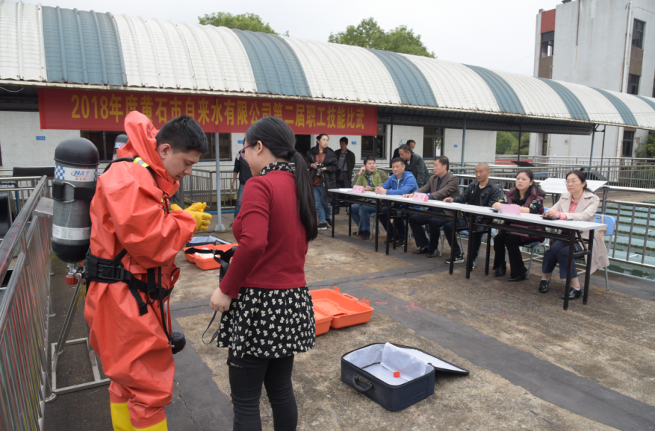 當(dāng)天上午,首先在公司二樓會議室舉行了“職工技能比武”理論考試。公司領(lǐng)導(dǎo)高度重視,現(xiàn)場巡視。考試過程中,參考人員和監(jiān)考人員嚴(yán)格遵守考試紀(jì)律,參考人員答題認(rèn)真,監(jiān)考人員監(jiān)考嚴(yán)格。在下午的實(shí)操考試中,共分為運(yùn)行值班工比賽、維修電工比賽、水質(zhì)檢驗(yàn)工比賽以及防化服穿戴等四個項目。其中,水質(zhì)檢驗(yàn)工比賽主要測試職工水質(zhì)檢驗(yàn)工基本理論知識和水質(zhì)日常檢測七項、九項指標(biāo)基礎(chǔ)理論知識。維修電工比賽需根據(jù)安全技術(shù)操作規(guī)程完成試題要求。運(yùn)行值班工比賽以現(xiàn)場答題的方式,回答評委提出的問題。防化服穿戴比賽,要求兩人一組相互配合,根據(jù)防化服穿戴規(guī)范程序在規(guī)定的時間內(nèi)正確完成穿戴。