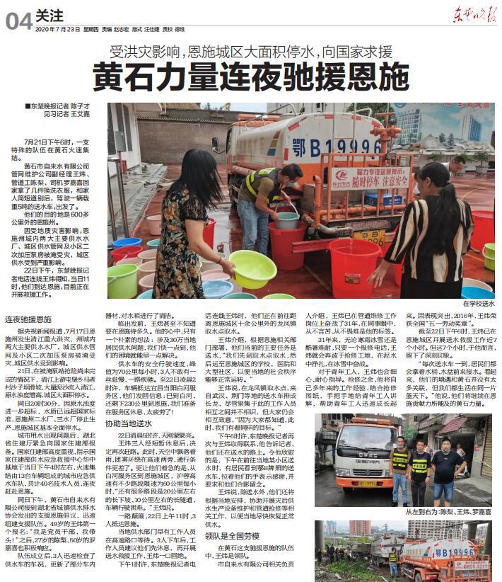 市自來水有限公司派專人支援恩施水司的舉動(dòng)得到了《東楚晚報(bào)》記者關(guān)注,并于7月23日作了《受洪災(zāi)影響,恩施城區(qū)大面積停水,向國家求援——黃石力量連夜馳援恩施》專題報(bào)道,引起廣泛關(guān)注和好評。