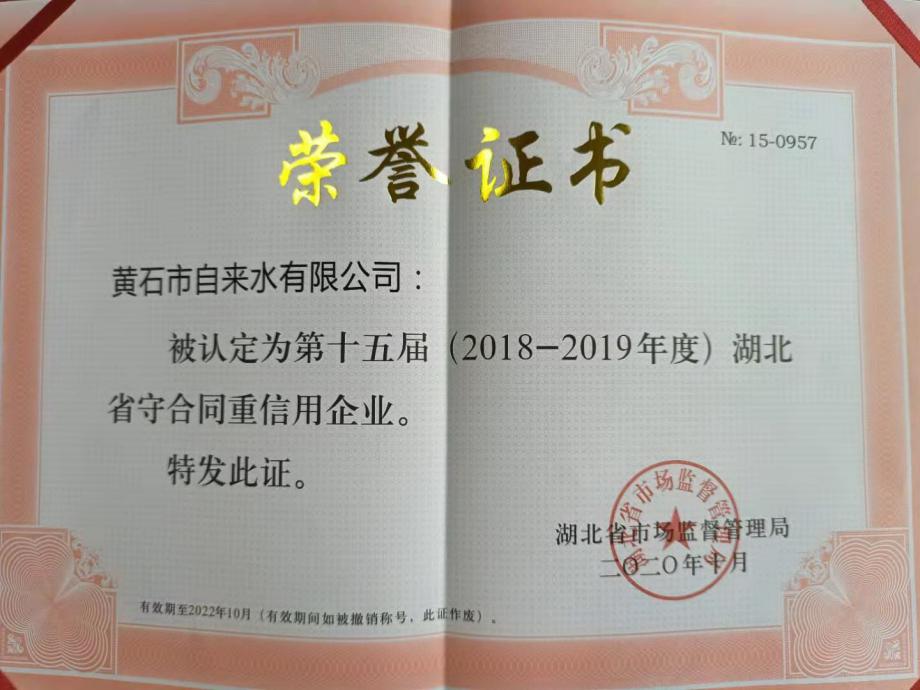 12月3日,市市場(chǎng)監(jiān)督管理局向市自來(lái)水有限公司頒發(fā)湖北省第十五屆(2018-2019年度)“守合同重信用”企業(yè)榮譽(yù)證書。