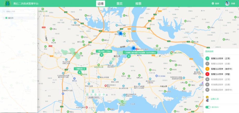 目前市場上二次供水泵房建設(shè)廠家較多,采用的技術(shù)和標準不統(tǒng)一,信息系統(tǒng)也不盡相同,這在無形中使每一個二次供水泵房都變成了一個信息孤島,智慧泵房并未達到真正的智慧化管理。黃石市自來水有限公司二次供水泵房管理平臺的上線,打破了這些信息孤島屏障,統(tǒng)一了二次供水泵房信息接入,目前黃石市自來水有限公司已完成奇力士、威派格、賽萊黙、華振、熊貓等多個設(shè)備廠家,15個小區(qū)泵房的數(shù)據(jù)接入。