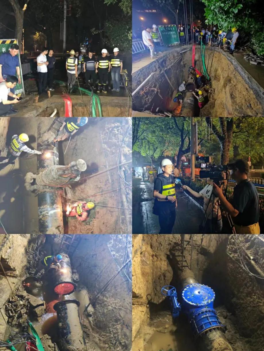 夜幕降臨,搶修現(xiàn)場熱火朝天,公司領(lǐng)導(dǎo)們與搶修人員共同奮戰(zhàn),安排部署搶修設(shè)備、物資。晚上21點(diǎn),天氣突變,面對(duì)突如其來的降雨,搶修人員拿起雨衣分成兩組,立馬趕往施工地點(diǎn),各盡其職,分頭行動(dòng),冒雨維修,閘門更換、干管搶修工作齊頭并進(jìn),有序展開。