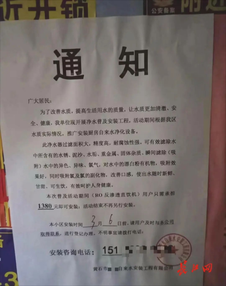 “此凈水器過濾面積大,精度高,耐腐蝕性強(qiáng),可有效濾除水中所含有的水銹、泥沙、水垢、重金屬、固體雜質(zhì)、瞬間濾除(吸附)水中的異色、異味、氯氣、對(duì)水中的漂白粉等有機(jī)物,吸附效果好……”在一張通知中,記者看到,這張蓋有“黃石市某自來水安裝工程有限公司”的印章的通知中,有大量文字描述該凈水設(shè)備的優(yōu)點(diǎn),并表示活動(dòng)結(jié)束后,將不再另行安裝。