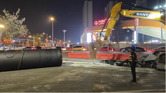 由于該施工現(xiàn)場屬于城市要道,車輛、來往行人多,交通壓力大,施工必須趕在夜間完成,早上6點前需要開放交通,施工時間極其緊迫。為盡快還路于民,減小對市民上下班及生活的影響。前期,市水務(wù)集團(tuán)工程公司多次組織技術(shù)人員深入現(xiàn)場勘察,科學(xué)研判,制定詳細(xì)的遷改方案。當(dāng)晚22時,交通圍堵完成后,工程公司組織精兵強(qiáng)將,增配多臺機(jī)械設(shè)備同時投入戰(zhàn)斗?! ?/span>